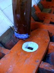 | Stepping the main mast Mast heel being positioned over step Notice coin and black sand in mortise |