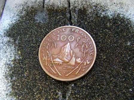 | Tahitian coin and black sand I collected the black sand from Matavai Bay, Tahiti while sailing on the HMAV BOUNTY built for the Anthony Hopkins/Mel Gibson movie "The Bounty" |