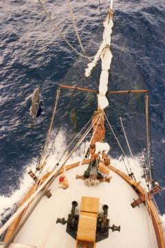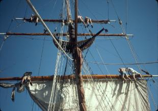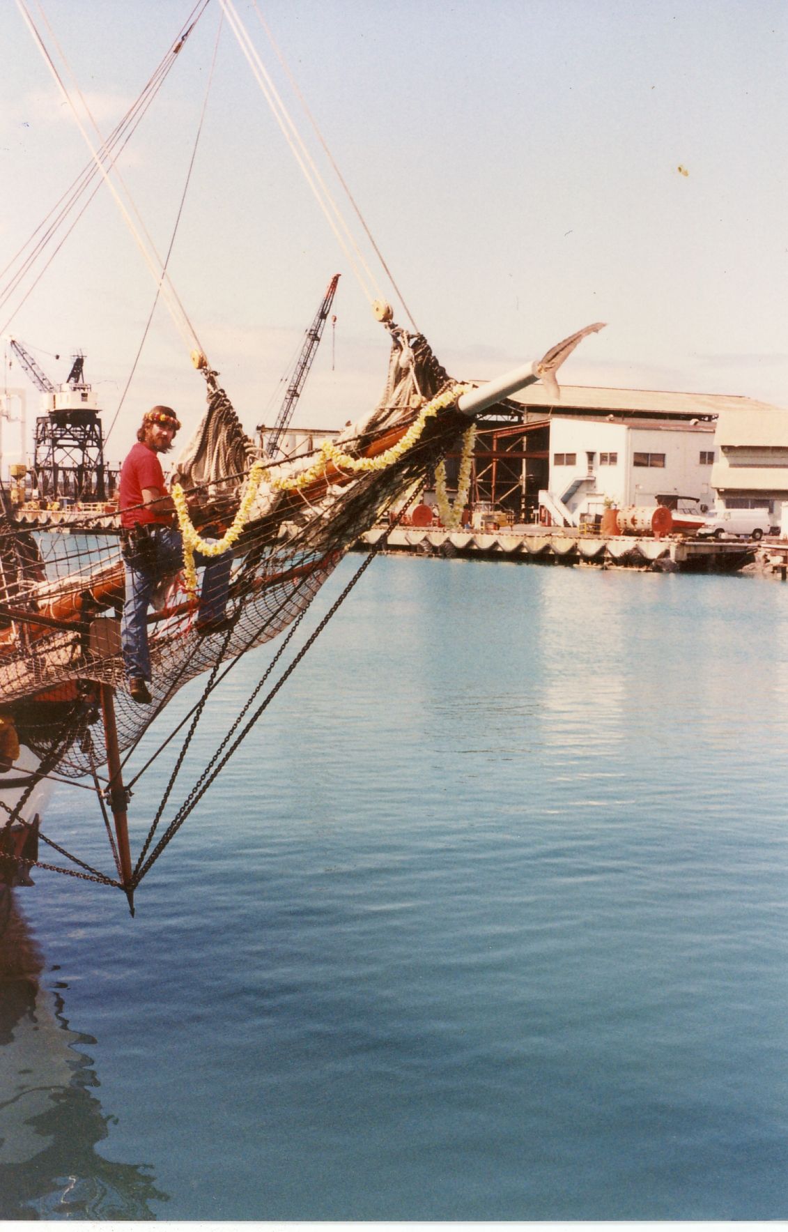 | Lashing a flower lei to he jibboom and adjusting Dore topmast staysail halyard.. It is tradition to cast the lei off when passing Diamond Head. |
