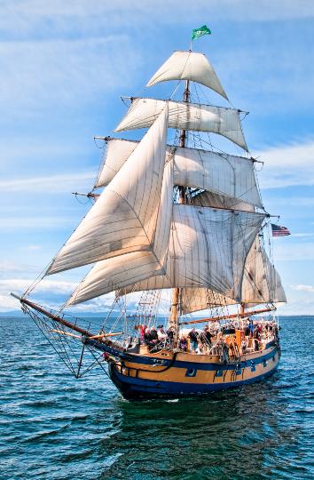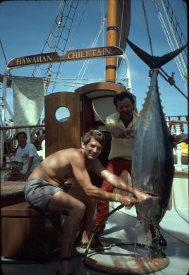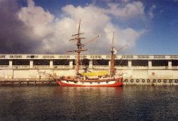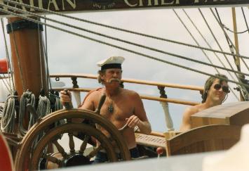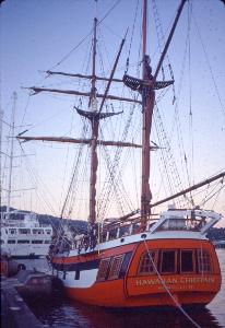 | Hawaiian Chieftain is a 103-foot square-rigged topsail ketch owned and operated by Grays Harbor Historical Seaport. Built in Lahaina, Hawaii in 1988, she is a contemporary interpretation of a traditional design based on the European trading vessels that called in Hawaii during the 18th-century. Hawaiian Chieftain was commissioned by Laurence H. “Baron” Dorcy, Jr., who intended to use teh vessel to trade among the Hawaiian and South Pacific Islands. Her design of shallow draft and twin turbo diesel engines allow her to sail in many isolated lagoons and pull up in to the beach, using her powerful twin diesels to pull herself off upon departing. Hawaiian Chieftain's maiden voyage was from Honolulu to Tahiti with a return to Honolulu and then on to San Francisco. I had the good luck of sailing abord her as first mate during this maiden voyage. After arrival in Sausalito, I was captain for a couple of daysails including racing in the Master Mariners Regatta. Over the years, the ship changed owners several times finally being purchased by Gray's Harbor Historical Seaport Authority. The ship was laid up after wastage of steel plate was discovered in 2020 and is currently up for sale. |